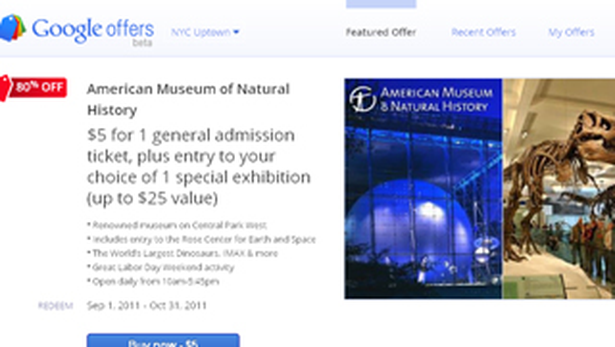 Google a promovat ieri prima oferta. Un bilet la orice expozitie de la Muzeul National al Istoriei Naturii din New York costa numai 5$ in loc de 25$. Momentan site-ul nu are prea multe oferte, dar in scurt timp vrea sa se lupte cu gigantul din acest domeniu, Groupon, care are incasari de 760 de milioane de dolari anual.