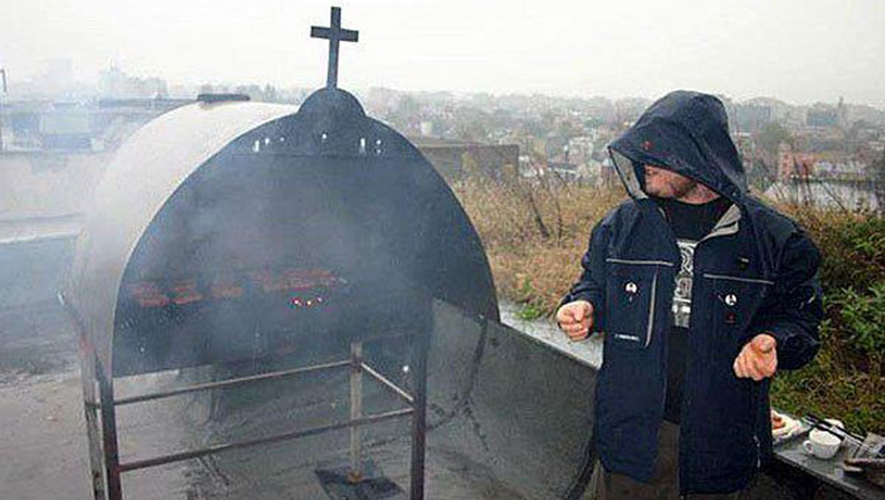 Cine spune ca romanii nu sunt inventivi? Tanarul acesta a gasit o modalitate noua de a face rost de instrumentele necesare pentru un gratar bun: pe langa furculite si cutit luate de acasa, a venit cu spatiul special amenajat de biserici pentru aprinderea de lumanari la vii sau la morti. Distractia a avut loc pe terasa unui bloc unde baietii au urcat cu greu noua achizitie care nu a avut loc in lift, dar faptul acesta si vremea racoroasa nu i-au impiedicat de la un picnic traditional romanesc cu mici si carnati!