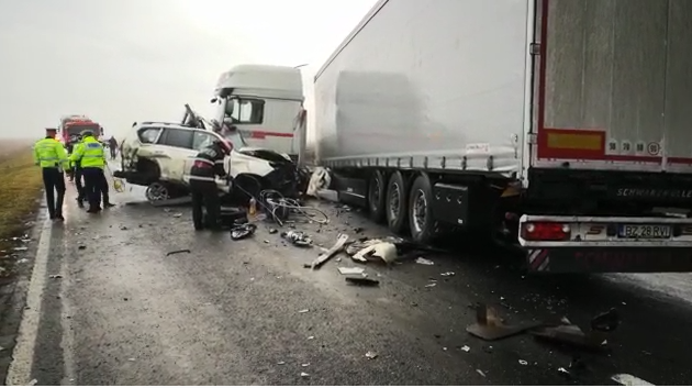 Două persoane au decedat și alte două au fost rănite în urma unui accident grav ce a avut loc în Brăila. Au fost implicate un autobuz cu pasageri, un autoturism și un autocamion