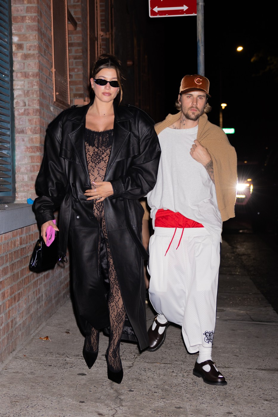 3. Hailey Biber, într-un trenci negru, de piele, și un body de dantelă, în aceeași nuanță, cu cohelari și geantă (sursa FOTO: Profimedia)