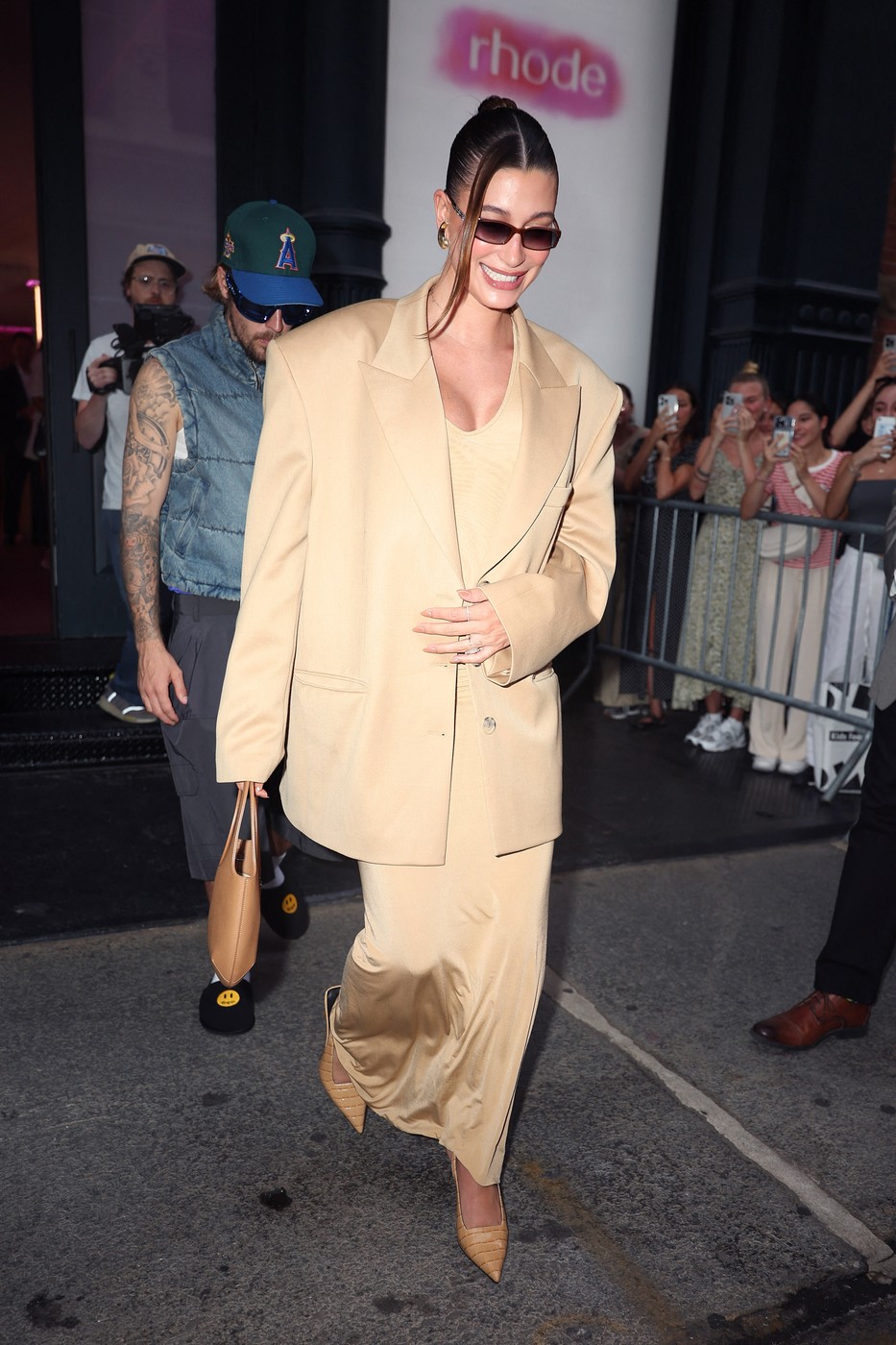 2. Hailey Biber, într-un blazer oversized bej/maro și șrochie mulată, în aceeași nuanță (sursa FOTO: Profimedia)