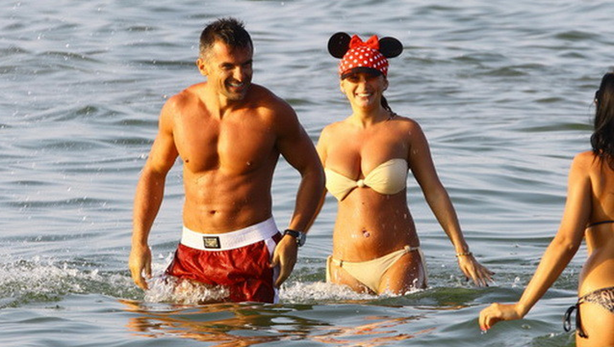 Imbracat intr-un costum de baie bej, al carui sutien de abia ii acoperea sanii imensi, Roxana Vancea s-a harjonit in apa cu noul iubit.