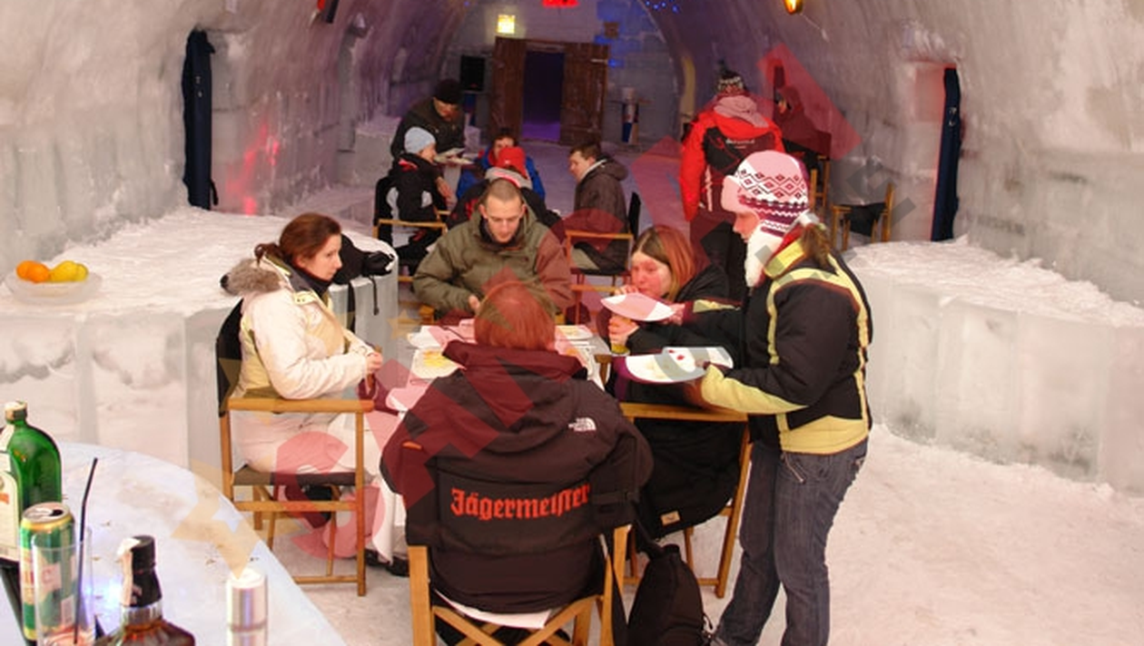 Britanicii au inchiriat pentru trei nopti palatul de clestar, unic in sud-estul Europei, petrecand in premiera la temperaturi apropiate de zero grade Celsius. Englezii vor ramane in aceasta iarna principalii beneficiari ai ospitalitatii de gheata, pentru ca alte circa 300 de persoane si-au facut deja rezervari printr-un operator turistic britanic. Cat priveste meniul servit in noaptea de Anul Nou, acesta a fost complet asortat decorului. Preparatele din peste, de exemplu, au fost servite pe mici platouri de gheata! Petrecaretii s-au infruptat si din medalion de mistret adus la masa pe farfurii normale, inscriptionate cu numele statiunii.