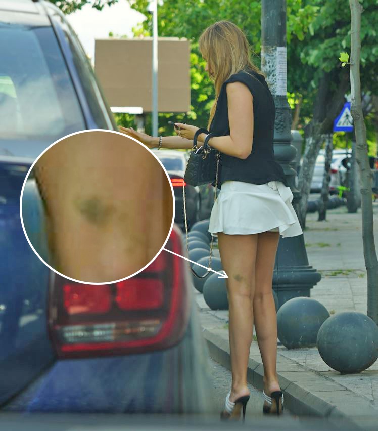 Pe stradă nu a pierdut timpul, preferând să vorbească la telefon. Pe piciorul stâng al neastâmpăratei blondine trona o vânătaie marcă înregistrată. Nu excludem ca opera să-i aparțină chiar lui “Termopane”, rănit în orgoliu după ce nu a reușit să-i aplice o corecție și celui care i-a posedat iubita.