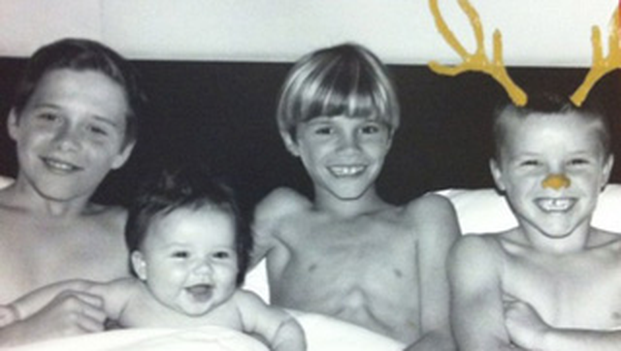 Fotbalistul si-a pozat copiii in pat, in timp ce rad cu gura pana la urechi sI a transformat fotografia intr-o felicitare de Craciun, pe care el sI Victoria o trimit tuturor rudelor sI prietenilor lor. Cel mai nou membru al familiei, micuta Harper Seven, de numai cinci luni, este tinuta de fratele ei, Brooklyn (12 ani). Mai departe, ii putem vedea pe Romeo (noua ani) sI Cruz (sase ani), acesta din urma alegandu-se cu un nas sI niste coarne aurii, adaugate pe calculator, pentru a-i da fotografiei o nota festiva.