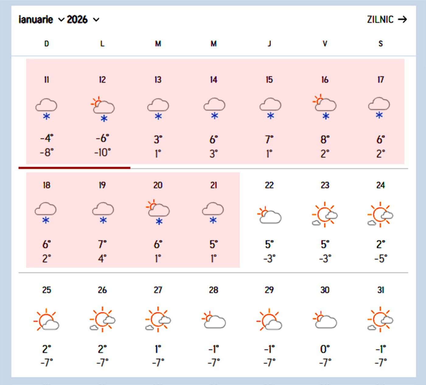 „Cel mai frig va fi în depresiunile din estul Transilvaniei, dar și în nordul Moldovei. Practic, începând de astăzi, o vreme rece în jumătatea nordică a țării, cu maxime preponderent negative, între minus nouă și cel mult 0°C. Urmează o noapte rece, cu minime termice între -14 și -10 grade în nordul Moldovei și în estul Transilvaniei, acolo unde va fi în vigoare și o atenționare meteorologică de cod galben. În nordul Moldovei, cel mult valori în jurul a -10 grade.