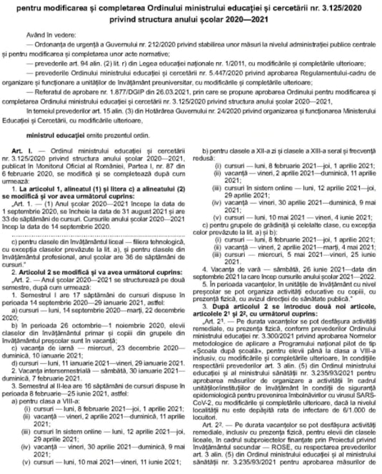 A fost publicata in Monitorul Oficial noua structura a anului scolar 2020-2021 modificata prin Ordinul de ministru nr. 3.558 din 29 martie 2021.
