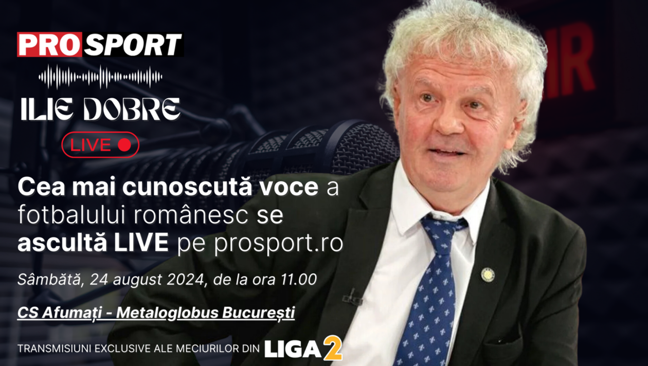 Ilie Dobre va comenta meciul de fotbal CS Afumați – Metaloglobus București, sâmbătă, 24 august 2024, de la ora 11.00. Comentariul LIVE va putea fi ascultat pe site-urile ProSport și LIGA 2, dar și pe paginile de Facebook și YouTube ale acestora.