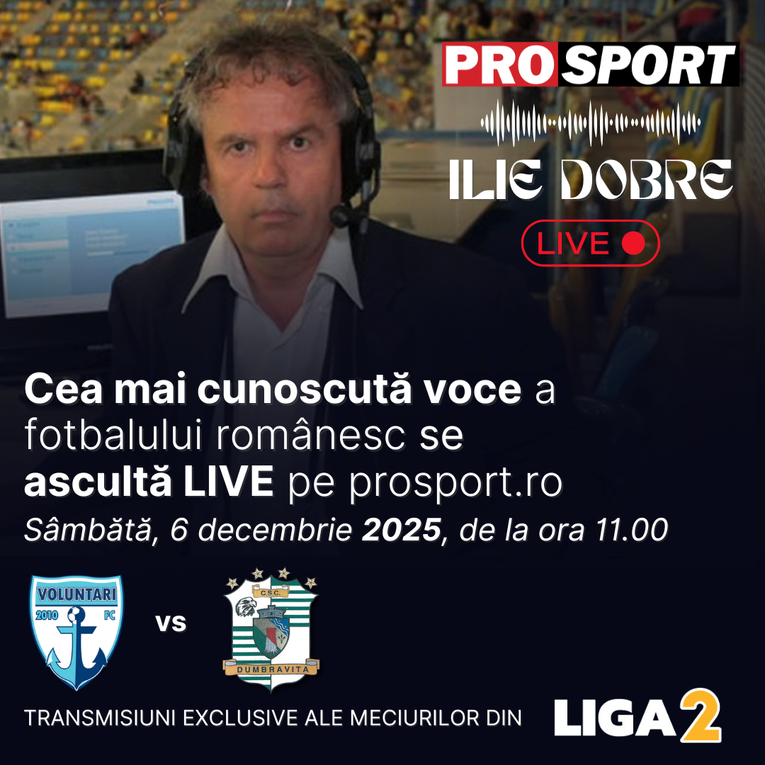 Ilie Dobre va comenta meciul de fotbal F.C. Voluntari – C.S.C. Dumbrăvița, sâmbătă, 6 decembrie 2025, de la ora 11:00. Comentariul LIVE va putea fi ascultat pe site-urile ProSport și LIGA 2, dar și pe paginile de Facebook și YouTube ale acestora.
