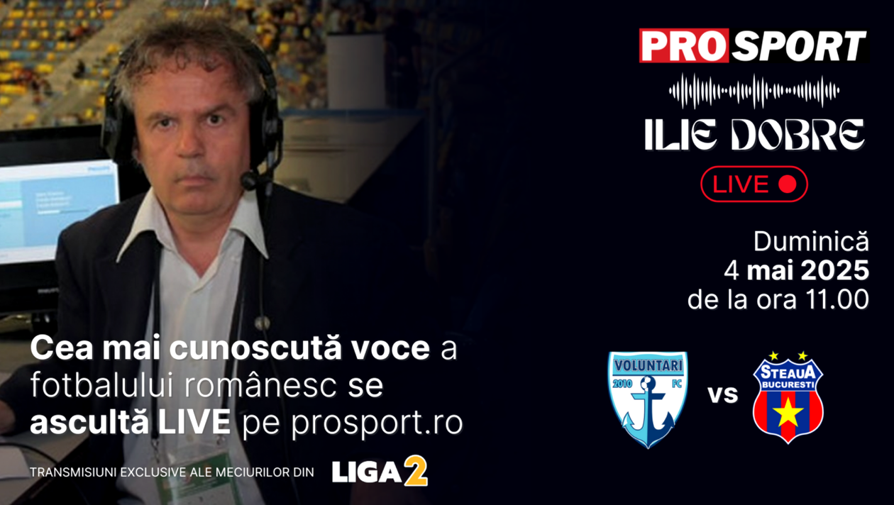 Ilie Dobre va comenta meciul de fotbal F.C. Voluntari – Steaua, duminică, 4 mai 2025, de la ora 11.30. Comentariul LIVE va putea fi ascultat pe site-urile ProSport și LIGA 2, dar și pe paginile de Facebook și YouTube ale acestora.
