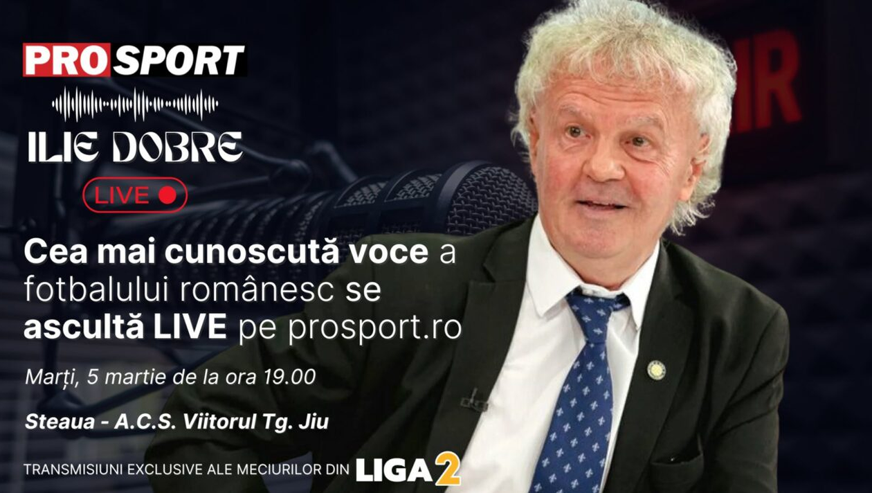 ILIE DOBRE va comenta cu meciul de fotbal Steaua-A.C.S. Viitorul Tg. Jiu, marți, 5 martie 2024, de la ora 19.00. Comentariul LIVE va putea fi ascultat pe site-urile ProSport și LIGA 2, dar și pe paginile de Facebook și YouTube ale acestora.