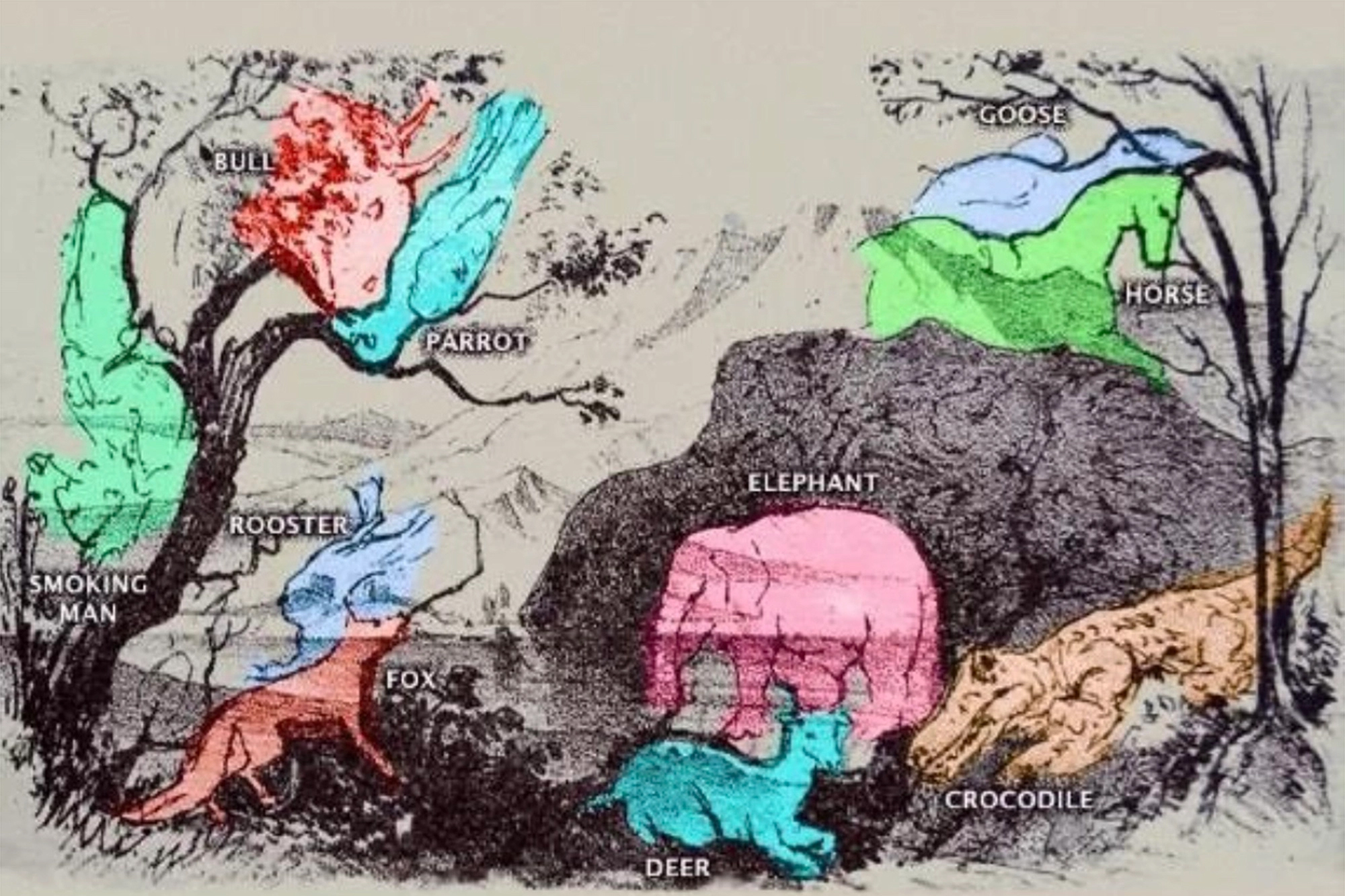 La prima vedere, în imagine se pot distinge câțiva copaci, un munte, un râu și câteva stânci, însă, în spatele acestui peisaj se află ascunse 9 animale și un om: un papagal, un taur, un elefant, un cerb, un crocodil, un cal, o gâscă, o vulpe, un cocoș și o persoană. Pentru a îți face munca mai ușoară îți vom da o serie de indicii ajutătoare: elefantul, cerbul și crocodilul se află în imediata apropiere unul de celălalt. Dacă sunteți în căutarea mai multor indicii, crocodilul se află deasupra unui cal și a unei gâște. Papagalul și taurul stau cocoțați în copac, în timp ce omul care fumează se află în stânga acestuia,