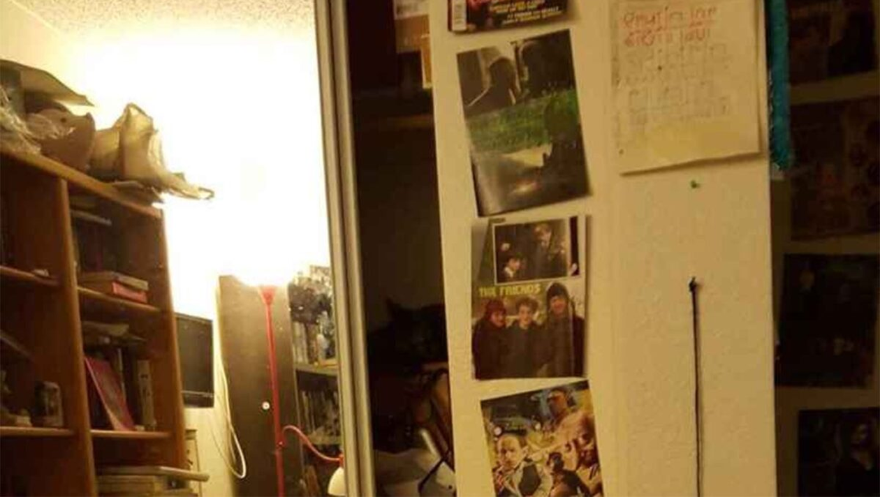 Imaginea de mai sus descrie o cameră dezordonată. O pisică poate fi văzută ascunsă în dulap; poate fi identificată după trăsăturile sale care o deosebesc de haine. Hainele și alte accesorii pot fi văzute aruncate peste tot.
