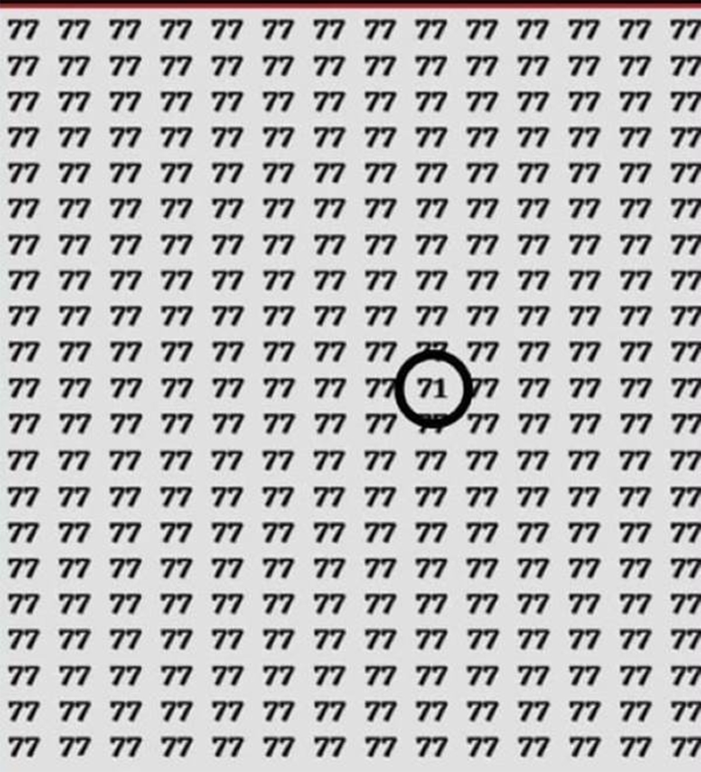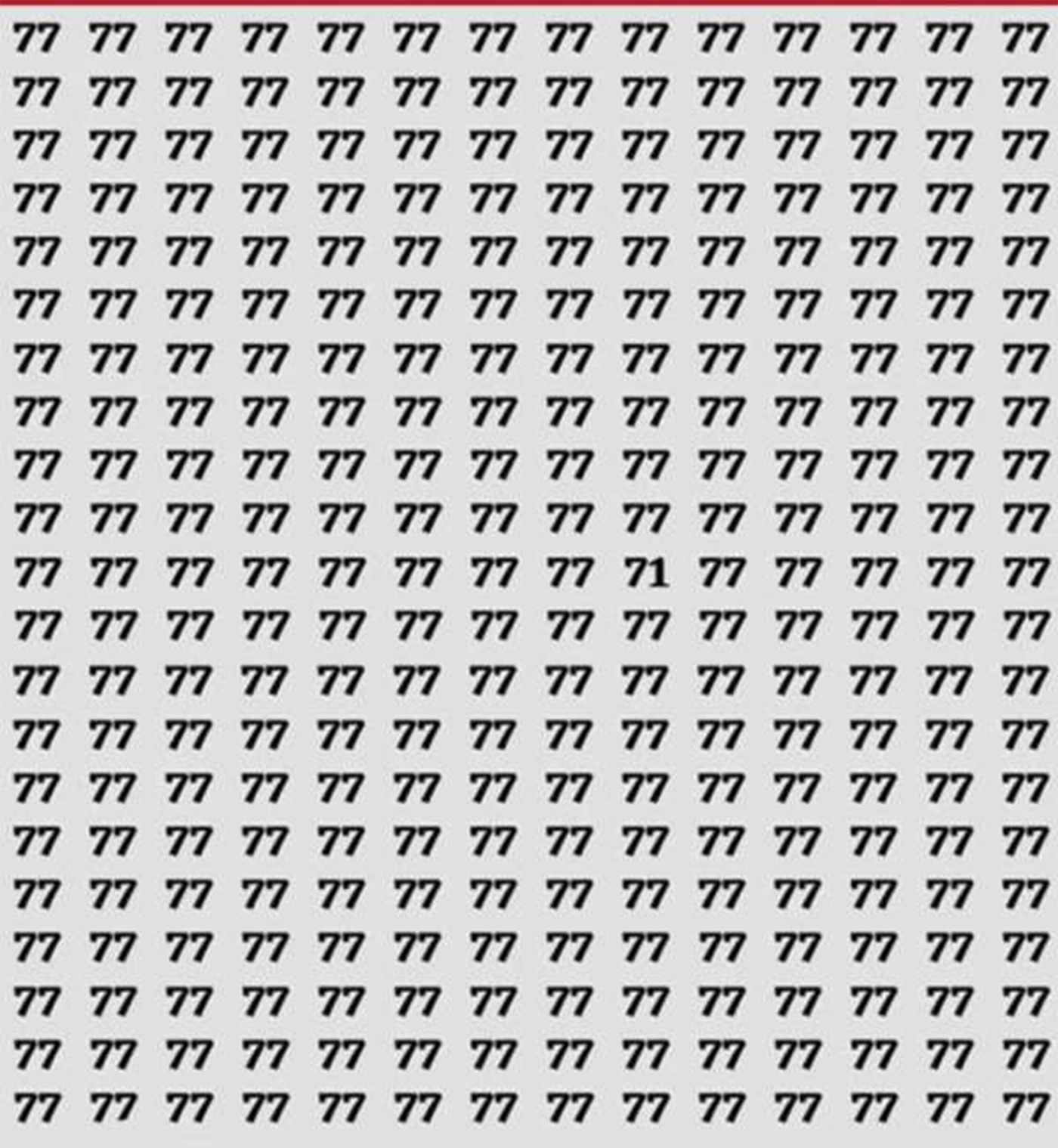 Astăzi, vă prezentăm o nouă iluzie optică virală. De data aceasta, în imagine se pot observa mai multe cifre cu numărul „77”, dar ascuns se află un intrus, care este alt număr. Tu l-ai găsit? Dacă a fost prea greu și încă nu ai găsit intrusul, te vom ajuta noi.