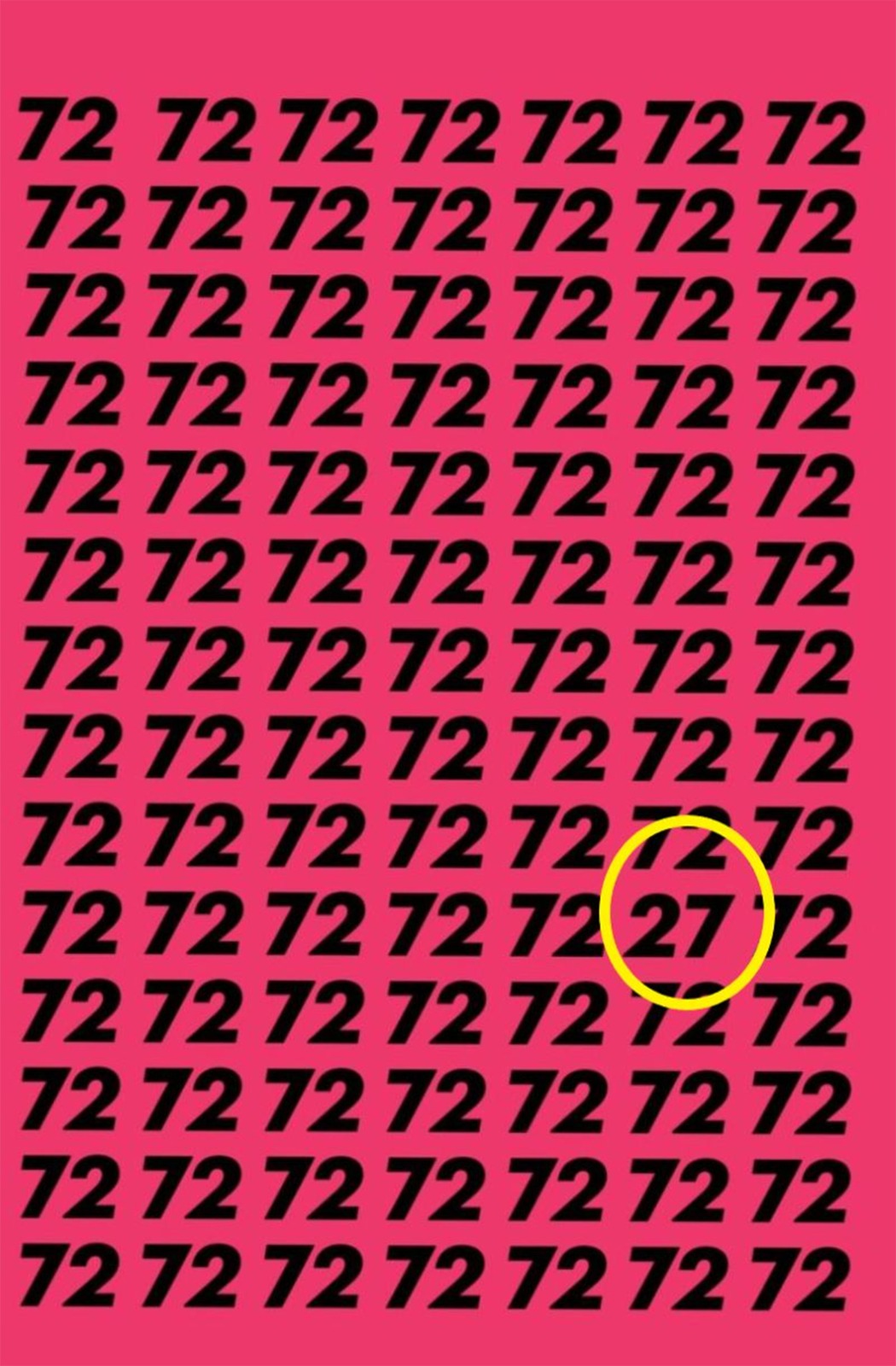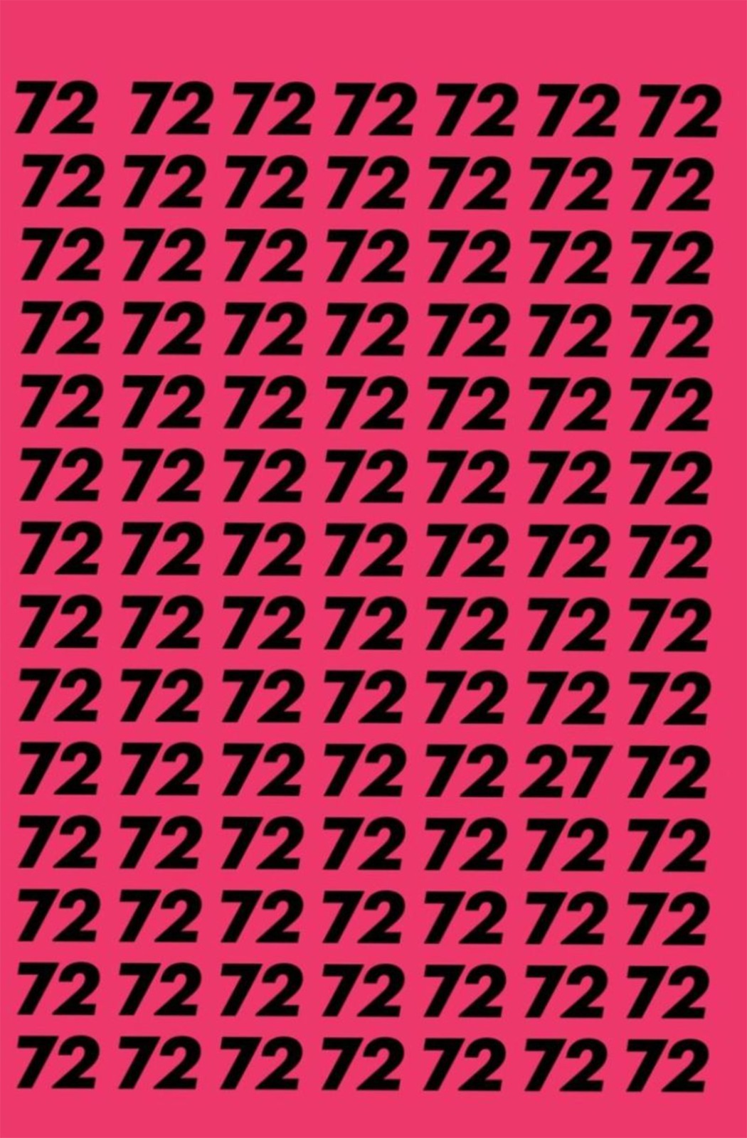 În imaginea prezentată se poate observa cum se repetă intens numărul 72. Însă printre rânduri se ascunde şi un 27. Crezi că îl poţi găsi?