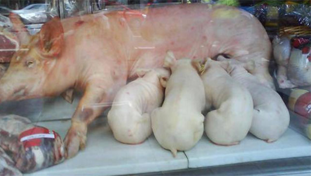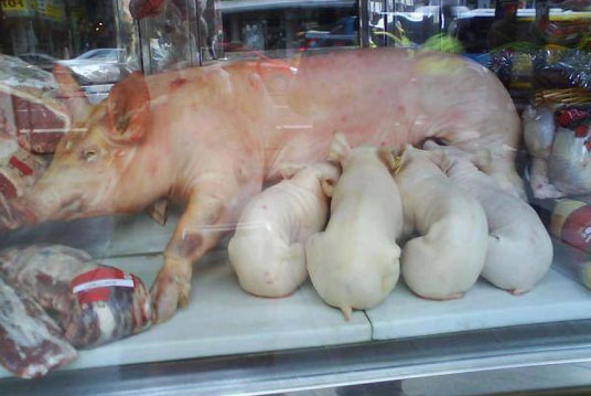 In vitrina macelariei stau la loc de cinste trei purcelusi ce par ca se hranesc de la mama lor. Imaginea este cat se poate de reala, avand in vedere ca niciunul dintre ei nu este viu. Imaginea a reusit sa socheze toti trecatorii din zona.