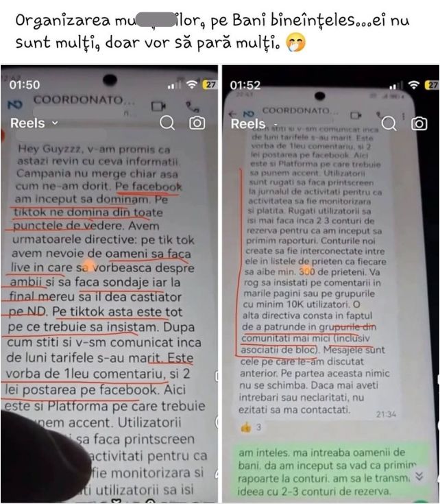 Mai exact, în secțiunea de comentarii de la una dintre postările lui Mihai Bendeac a apărut o fotografie în care apar câteva mesaje intrigante. Concret, în imagine se vede un grup de WhatsApp, iar mesajul transmis pare să fie din tabăra adversarului. De asemenea, se poate observa cum oamenii ar fi încurajați să vorbească despre Nicușor Dan, iar fiecare comentariu este remunerat cu 1 leu și fiecare postare pe Facebook cu 2 lei.