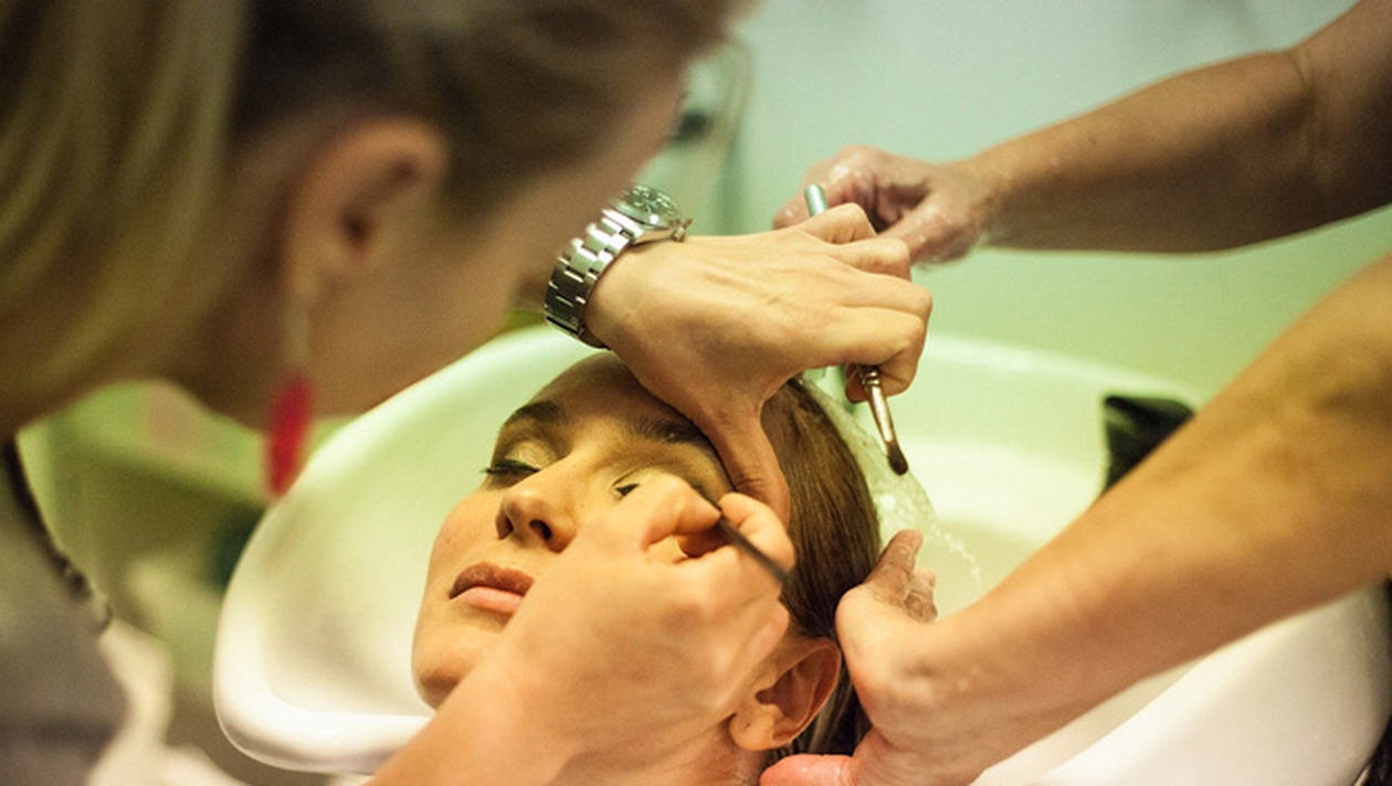 Ca sa economiseasca timp, cei care se ocupa de imaginea ei fac mai multe lucruri, in acelasi timp, dupa cum se poate vedea din fotografia in care apare cand este spalata pe par si machiata.