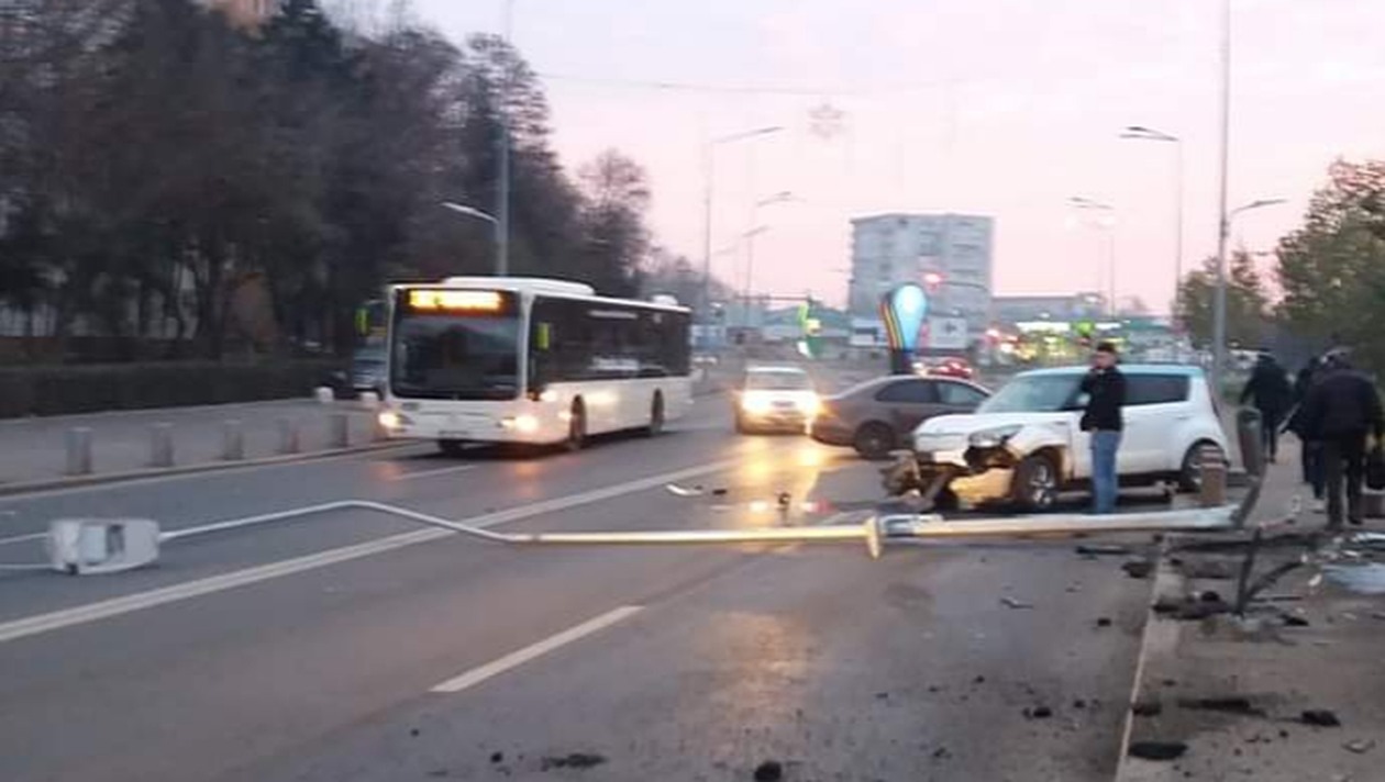 Șoferul unui autoturism nu a ținut cont de vreme și a apăsat până la ”blană” pedala de accelerație. Numai că a scăpat mașina de sub control, iar ulterior a doborât un stâlp de iluminat stradal și a lovit 10… borduri.
