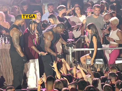 Spectacolul a început, artistul, furibund. Isterie în club, cum spuneam, dar finalul concertului a fost ”apocaliptic”! Pur și simplu, fetele s-au năpustit, la propriu, pe Tyga. Au urcat pe scenă, fiecare cum a putut, unele din elan, altele, ajutate de ”brandurile” uriașe ale bodyguarzilor cântărețului. Iar acolo l-au înconjurat pe ”bietul” Tyga, parcă și el uimit de popularitatea de care se bucură.