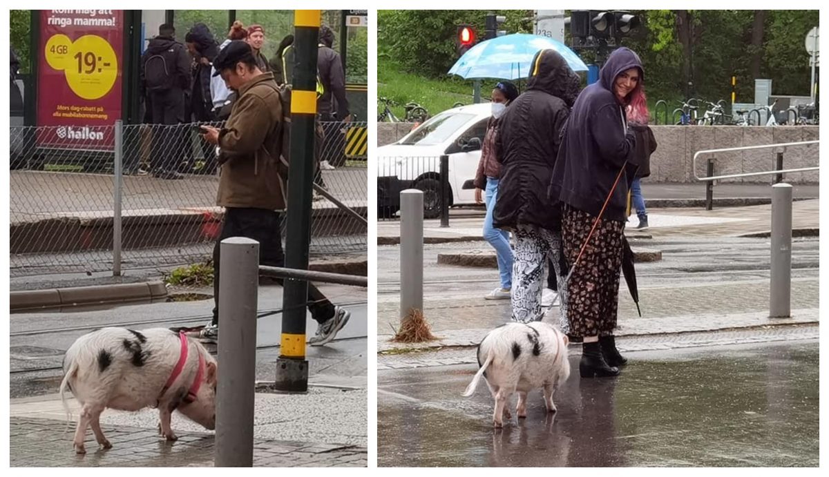 Așa cum se poate observa, o femeie tânără plimbă pe stradă un porc adult cu un ham special pentru câini. Dacă este să le luăm după zâmbetul pe care îl afișează, probabil a atras multe priviri.