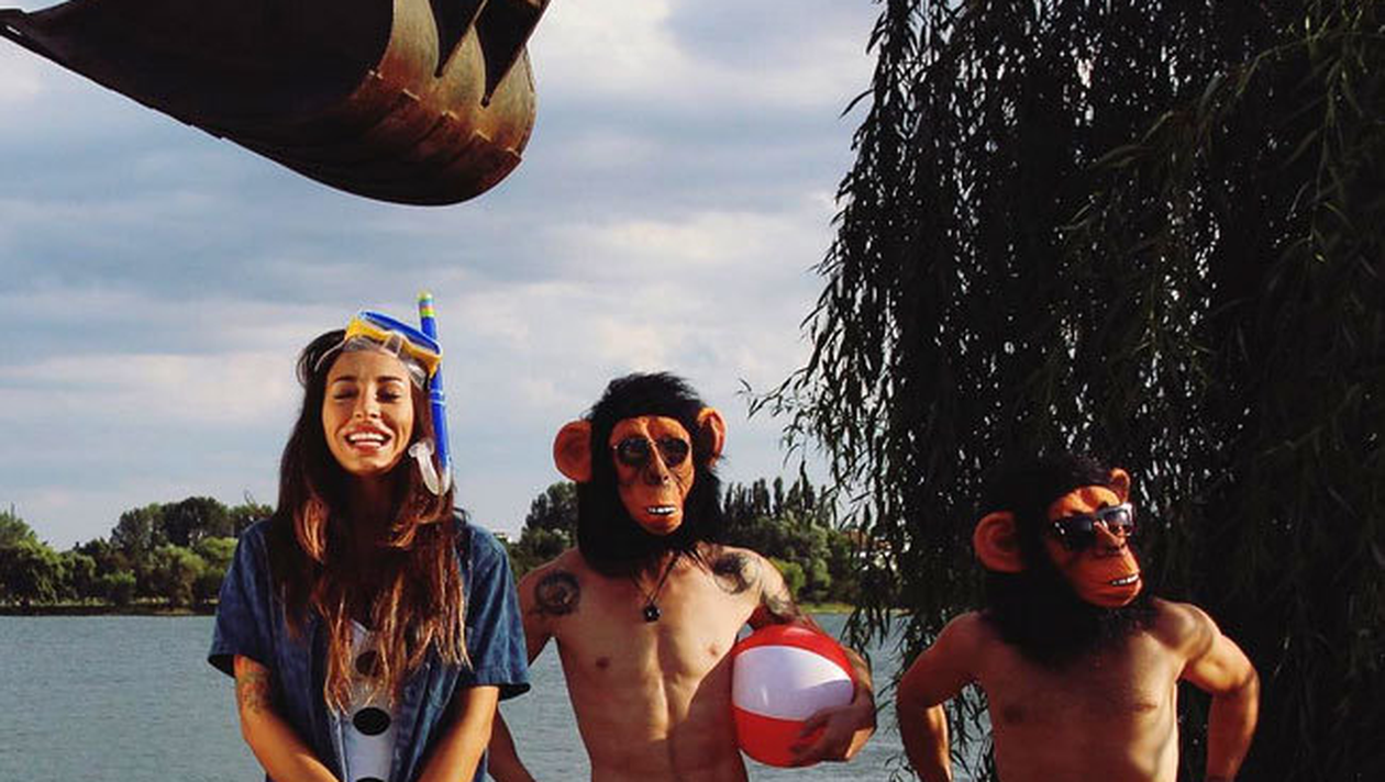 Aşa după cum se poate observa în fotografie, Ruby are o cămaşă pe ea, pentru a se proteja de soare, iar pe cap poartă un ”echipament” specific scufundărilor. Mai sus, se poate vedea ceva ce nu prea are ce căuta în această imagine, respectiv….cupa unui excavator. Elementul inedit cu care se confruntă Ruby o reprezintă însă cei doi băieţi de lângă ea, care poartă fiecare…câte o mască de maimuţă, iar amuzamentul situaţiei a fost repede remarcat de prietenii virtuali ai artistei. ”Superrrrr mega so funnyyyyyyyyy!!!” i-a scris o amică.