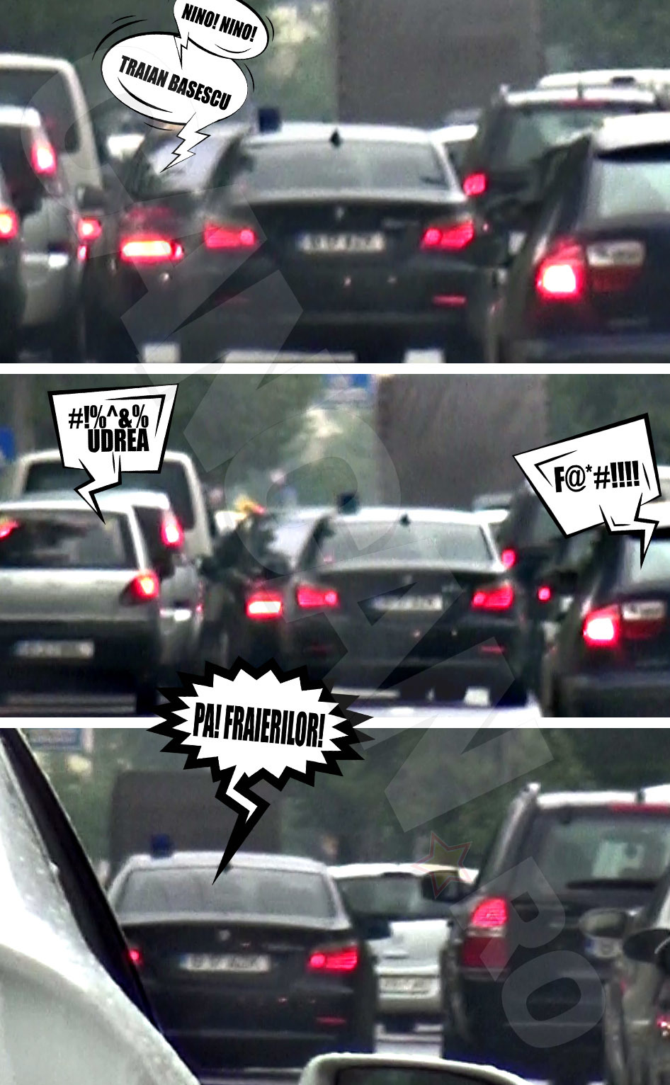 Să începem cu Traian Băsescu, filmat în urmă cu două săptămâni pe o ploaie mocănească, care a dat peste cap traficul şi aşa infernal din Capitală. Coloana în care se afla limuzina Mercedes a lui Traian Băsescu iese de pe o straduţă laterală din cartierul Primăverii, ajungepe Bulevardul Kiseleff, si se indreapta către ieşirea din Bucureşti. În apropiere de Casa Presei, se poate vedea foarte clar comportamentul agresiv al agenţilor SPP, care dadeau la o parte masinile soferilor aflati in ambuteiaj. Sirene, alarma mare, bastoane agitate pe geamul masinii.