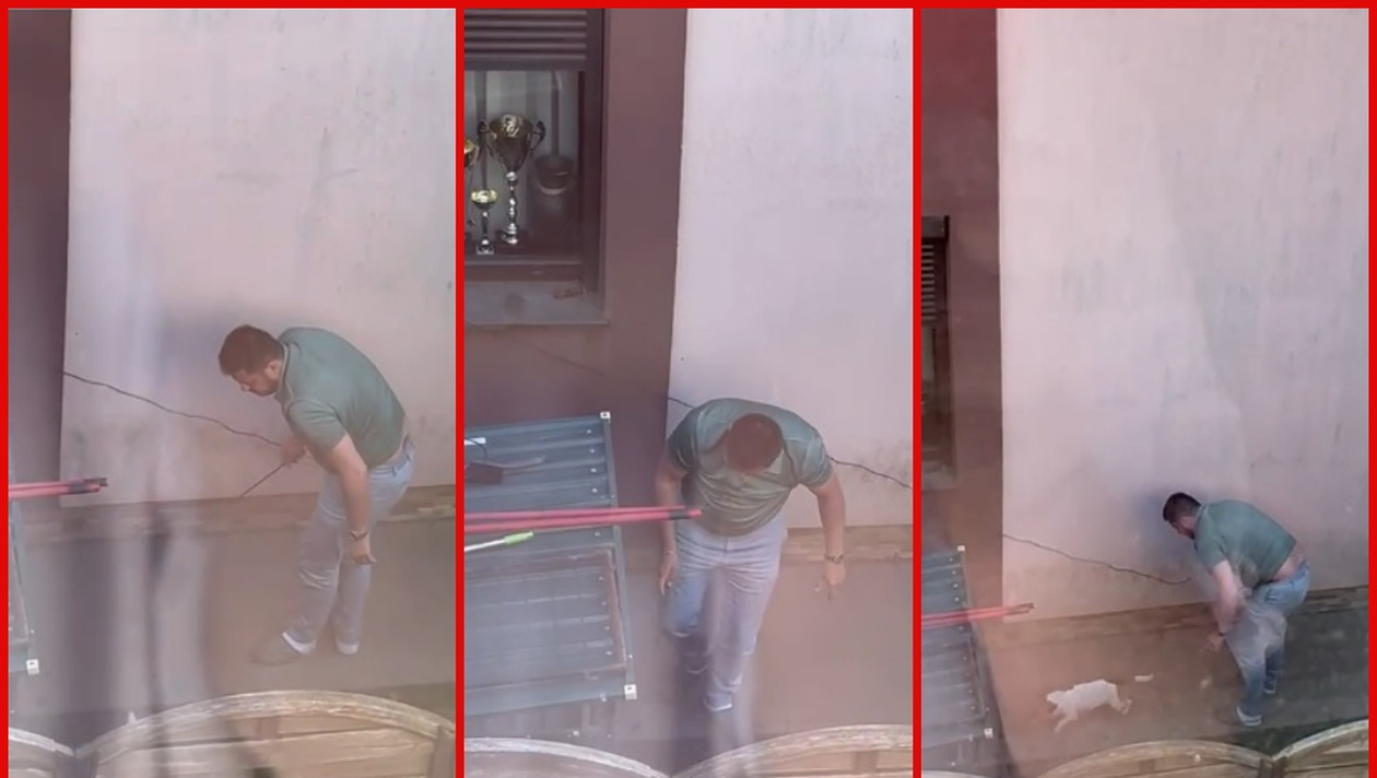 La un moment dat, în imaginile tulburătoare se poate observa cum sportivul îl strânge cu toată forța de gât pe unul dintre blănoși, apoi îl lovește cu o nuia peste față și picioare. Vorbim de doi câini, de talie mică, pe care bărbatul i-ar ține chiar în curtea casei, după cum se vede în videoclipul revoltător.