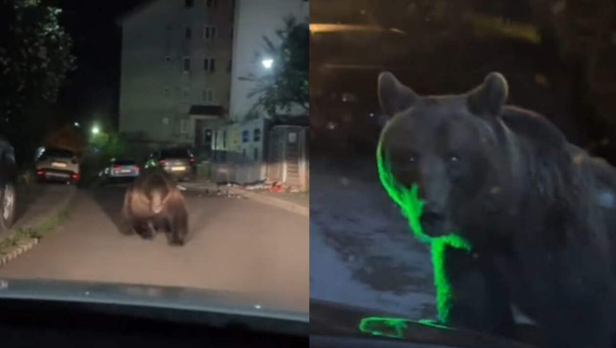 Imagini inedite pe o stradă din stațiunea montană Predeal. Un urs brun a fost filmat de camera de bord a unei mașini, imagini care surprind cum sălbăticiunea se pregătește să atace autoturismul.