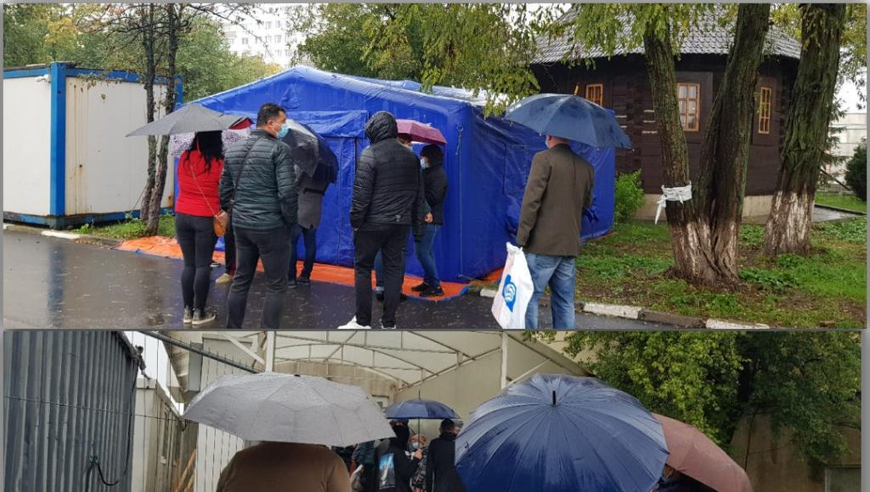 Doar la intrarea în unitatea medicală există un loc acoperit, ferit de ploaie, iar oamenii fără umbrele s-au îngrămădit și au uitat complet de distanțarea impusă de pandemia de coronavirus, mai scrie sursa citată.