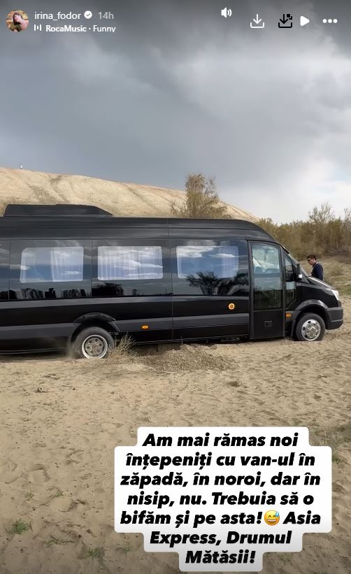 „Am mai rămas noi înțepeniți cu van-ul în zăpadă, în noroi, dar în nisip, nu. Trebuia să o bifăm și pe asta! Asia Express, Drumul Mătăsii”, a scris Irina Fodor, în mediul online.