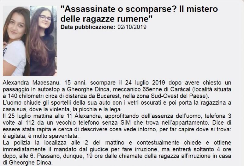 ”Alexandra Măceșanu, în vârstă de 15 ani, dispare la 24 iulie 2019, după ce a fost luată cu autostopul de Gheorghe Dincă, un mecanic în vârstă de 65 de ani din Caracal (un oraș aflat la aproximativ 140 km de București, în sud -vestul țării). Bărbatul a închis ușile mașinii sale cu geamurile vopsite și apoi a dus-o pe fată la casa lui, unde a legat-o, a violat-o și a bătut-o. În 25 iulie dimineața, la ora 11.00, Alexandra, profitând de absența bărbatului, a telefonat de trei ori la 112 de la un telefon vechi, fără SIM, găsit în locuință. Ea spune că a fost răpită și încearcă să descrie ceea ce vede în jur, pentru a-i face pe oameni să înțeleagă unde se află: este supărată, este foarte speriată. Poliția a localizat-o la două dimineața și solicită simultan și obține imediat un mandat de la judecător pentru intrare, dar va intra doar 4 ore mai târziu, la 6.00. Ei petrec, prin urmare, 19 ore de la apelurile fetei la casa lui Gheorghe Dincă”, se arată în articolul celor de la emisiunea ”Chi l’ha visto?” de pe RAI3, unde a fost difuzat și un material în care se solicită ajutorul italienilor, după ce apărut martori care susțin că le-ar fi văzut pe fete în Italia.