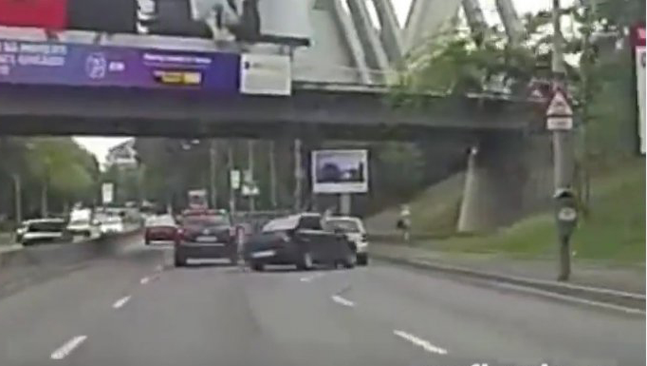 In imagini se vede o Dacia Logan care merge pe banda a treia. Soferul se grabeste sa intre pe banda a 2-a, in timp ce din spate un SUV il urmeaza indeaproape. Masina mai mare ramane pe banda trei si conducatorul ei face o manevra periculoasa. Franeaza, porneste avariile si in aceeasi secunda trage de volan dreapta. Loganul este acrosat iar soferul se pierde cu firea si trage total de volan. Loveste la randul lui o alta masina si ajunge in decor. Norocul a facut ca o femeie, pieton pe trotuar, sa nu fie lovita de autorismul scapat de sub control.