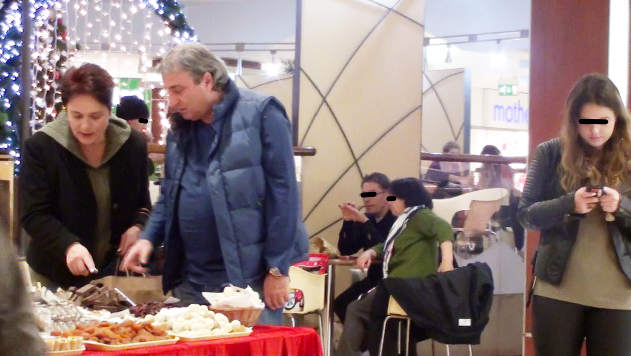 In fata standului, Mihai Stoichita si sotia lui au studiat atent toate produsele si au cerut vanzatoarei cate putin din aproape fiecare sortiment. In tot aces timp, fiica sotilor Stoichita a preferat sa stea cat mai departe de parintii ei, butonand telefonul mobil.