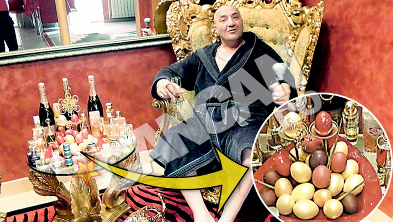 Devenit celebru datorita filmuletelor postate pe internet in care arunca cu bani in timp ce dansa pe ritmuri de manele, interlopul Nelson Mondialu, zis si Regele neincoronat al Clujului, uimeste din nou. De Paste, in locuinta sa poleita, nu doar jiltul personal este suflat cu aur, ci si ouale. Pe o masa plina cu bauturi si parfumuri scumpe pregatite pentru „udatul fetelor”, asa cum e obiceiul in Ardeal, clujeanul si-a pus la vedere cosul cu oua imbracate in foita de aur. „Eu am facut ouale aurii. Sunt cu foita de aur. Inainte de Paste am mers la un magazin de antichitati, de unde am cumparat foita cu 300 de euro, pe care am aplicat-o cu o solutie speciala”, ne-a explicat Nelson. Acesta a inscriptionat „brandul” Mondialu pe unul dintre oua, iar pe alt ou a scris „Lobo”, porecla fiului sau, Nelson Pop. Nelson Mondialu sustine ca de cinci ani e campion in casa la ciocnitul oualor.