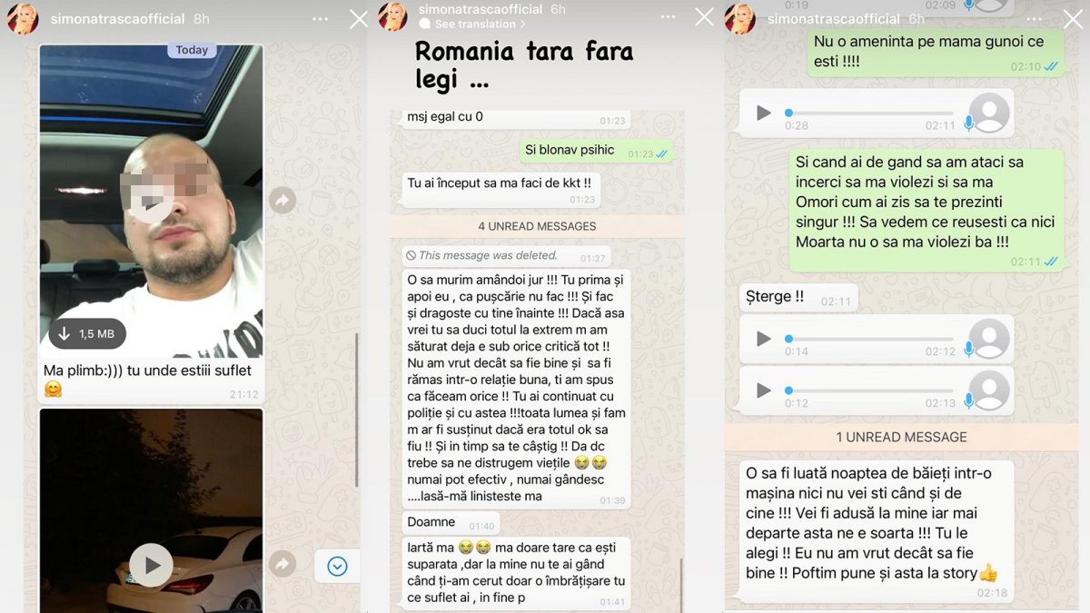 Simona Trașcă este îngrozită, dar nu-și pierde cumpătul, după cum se poate vedea în răspunsurile pe care i le dă hărțuitorului care o chinuie de multă vreme. Un nou episod s-a petrecut în urmă cu o zi, când vedeta a primit mesaje de la cel care și-o dorește, zice el, de iubită. Omul se invită la ea, mai mult, a aflat unde stă, iar, când este refuzat, amenință cu moartea. Și a ei, și a lui. Discuțiile sunt dure și înspăimântătoare. Iar dacă agresorului nu-i pasă de Poliție, de pușcărie, atunci Simona are toate motivele să ceară ajutorul. CANCAN.RO vă prezintă, în exclusivitate, discuțiile ireale purtate de cei doi, pe Whatsapp.