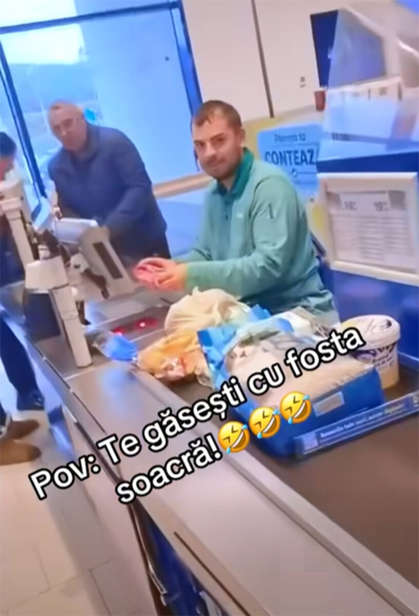 Surprins, bărbatul a ridicat privirea și a rămas pentru câteva secunde blocat, neștiind dacă să zâmbească sau să ignore complet remarca. Vizibil emoționat, el a zâmbit și și-a continuat treaba grăbit. Ne dăm seama de faptul că vizita neașteptată a fostei soacre l-a luat prin surprindere, mai ales din cauza faptului că nu mai știa să scaneze bine produsul după ce a văzut-o.