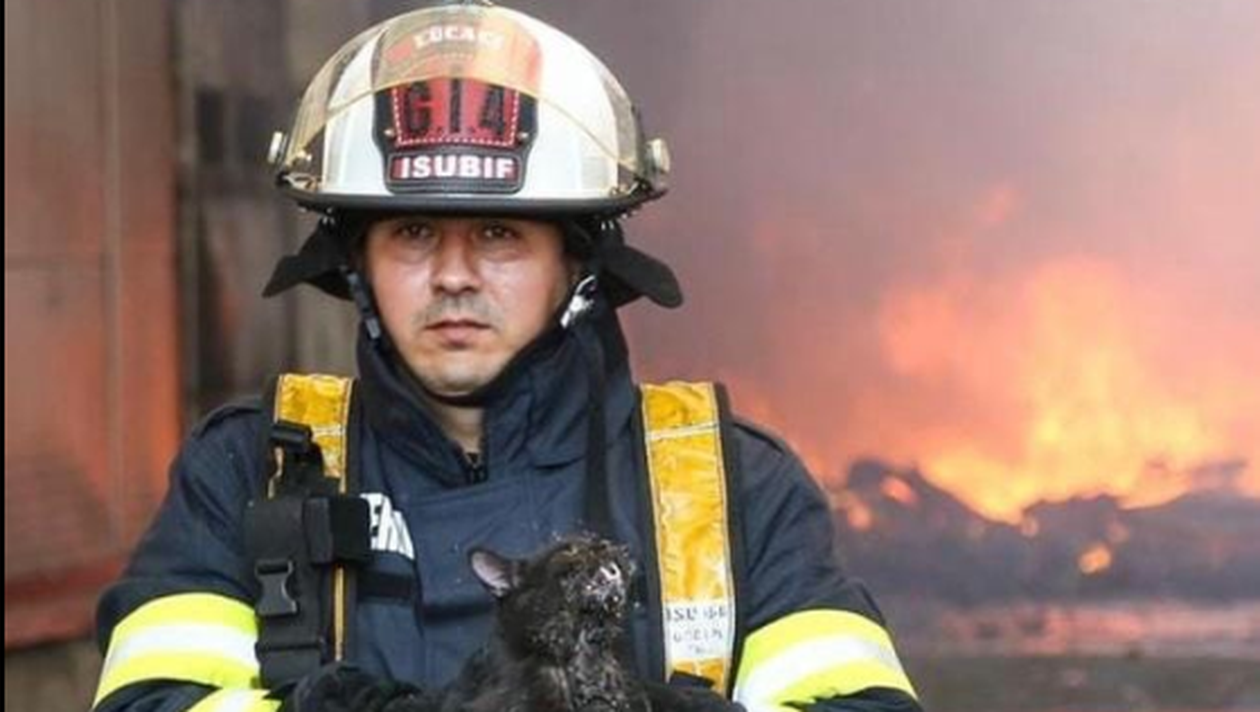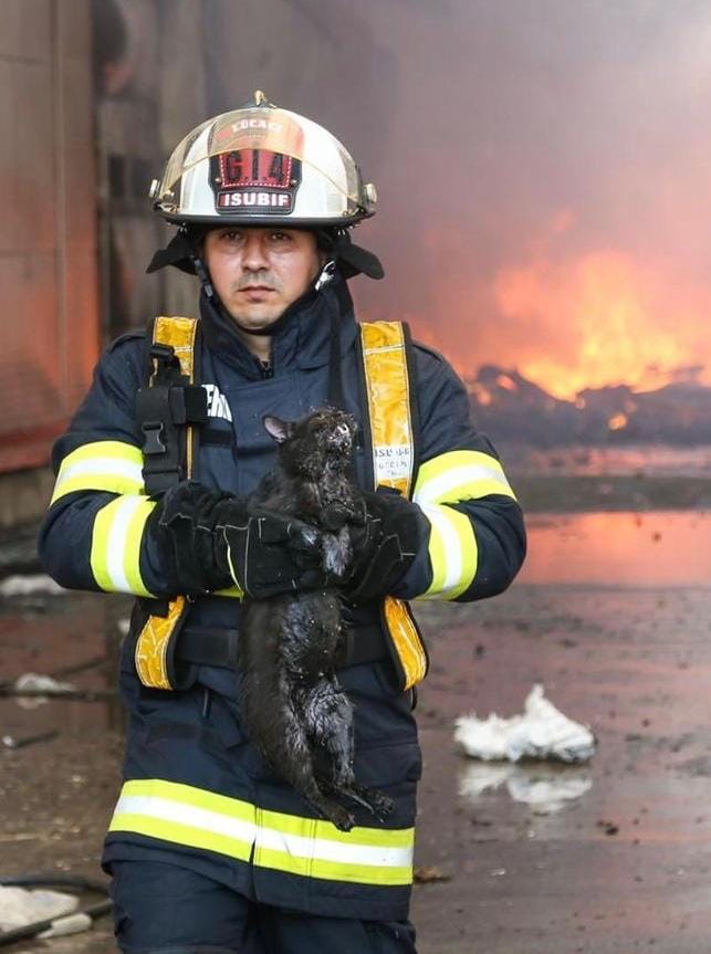 La un moment dat, cineva din flăcări spune că a dat de o pisică intoxicată cu fum. A scos animăluțul, l-a lăsat în grija colegilor, apoi s-a întors în kijlocul incendiului.