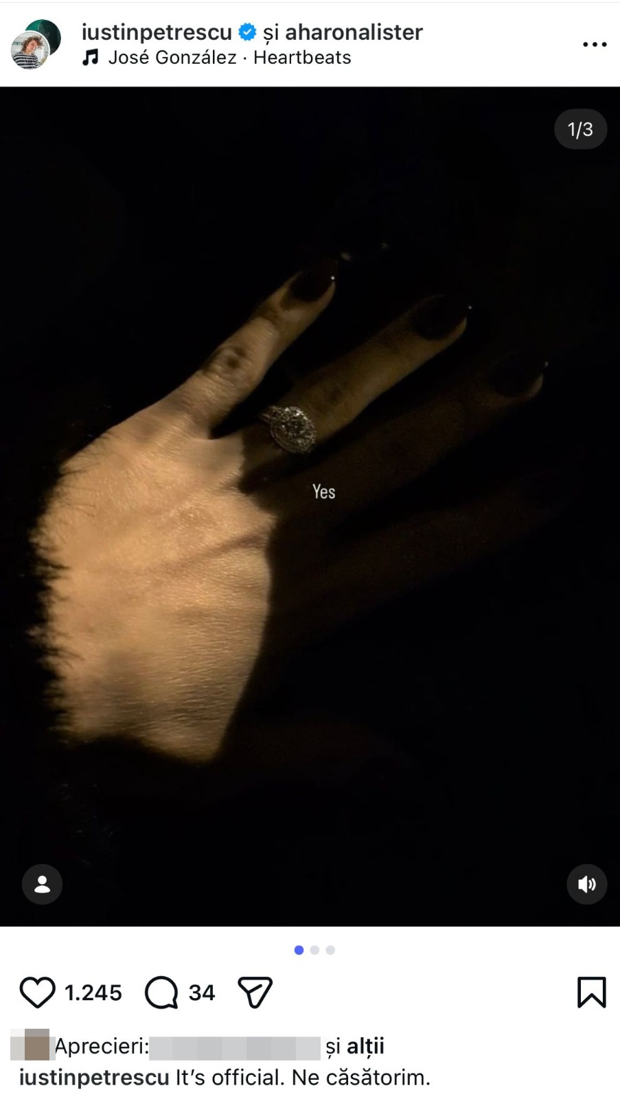 „În mare știm deja, avem rezervări făcute, am rochia, pantofii… Chiar am postat o poză cu baza rochiei pe Instagram acum puțin timp, dar doar câteva persoane și-au dat seama despre ce este vorba. M-a emoționat foarte tare postarea lui, a fost scrisă atent și din suflet. Nu am știut ce va scrie; știam doar că urmează să anunțe și m-a anunțat când era deja postată.” a declarat Hara, pentru CANCAN.RO