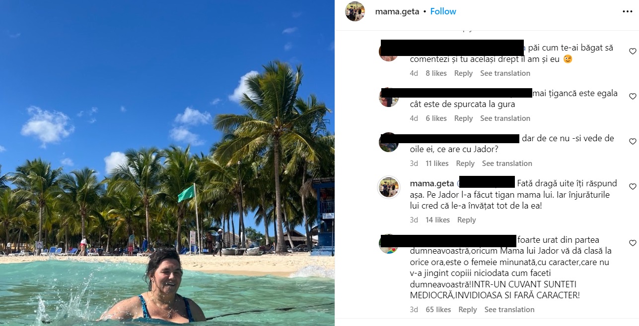 Doar că, ce să vezi? Scandalul nu s-a încheiat aici, căci mama Geta a comis-o lată, în secțiunea de comentarii chiar de la o fotografie postată de ea, din Republica Dominicană.