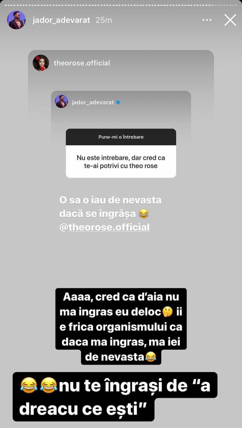 Jador a continuat: „Nu te îngrași de a dracu ce ești”. Tatonările dintre cei doi artiști le-au dat de gândit fanilor lor, care au crezut că aceștia sunt împreună și se tachinează. Cu toate acestea, Theo Rose este într-o relație cu un tânăr pe care îl iubește foarte mult și cu siguranță replicile dintre ea și Jador au fost doar…glume!