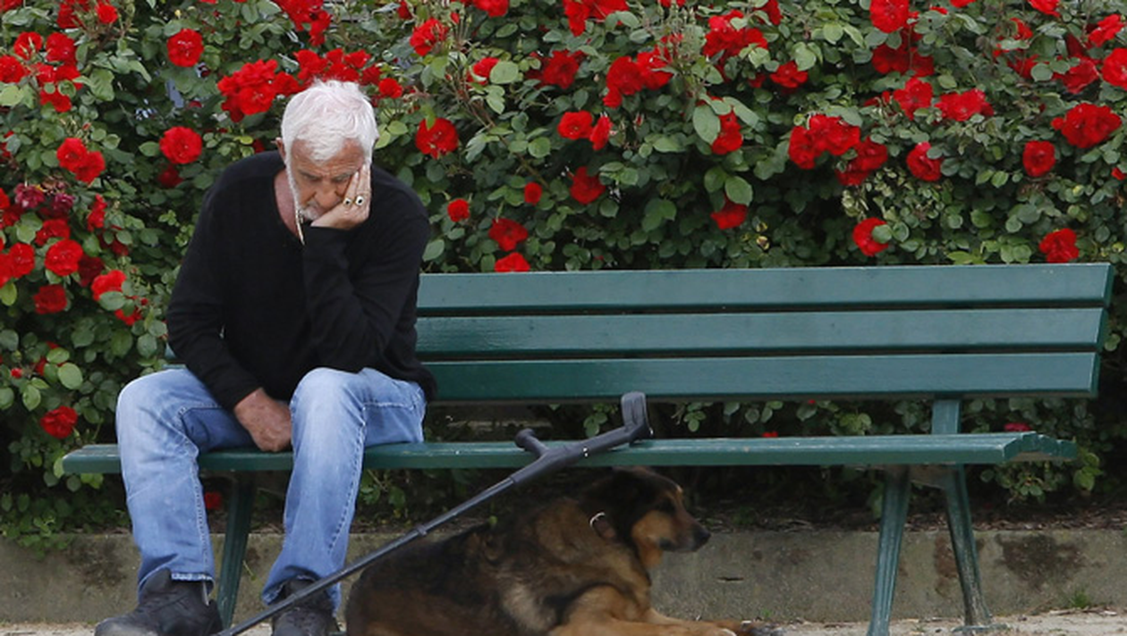 Batranelul Belmondo, care are nevoie de o carja pentru a se deplasa, s-a asezat cuminte pe o banca, cu cainele sau alaturi. Cu capul asezat in palma, starul a stat pe ganduri, cu carja langa el, in timp ce patrupedul s-a ascuns sub bancuta sI s-a odihnit pe asfalt. Cateva minute mai tarziu, Belmondo, sprijinit cu mana pe carja, a privit trist imprejurimile sI pe cei care au trecut pe langa el.