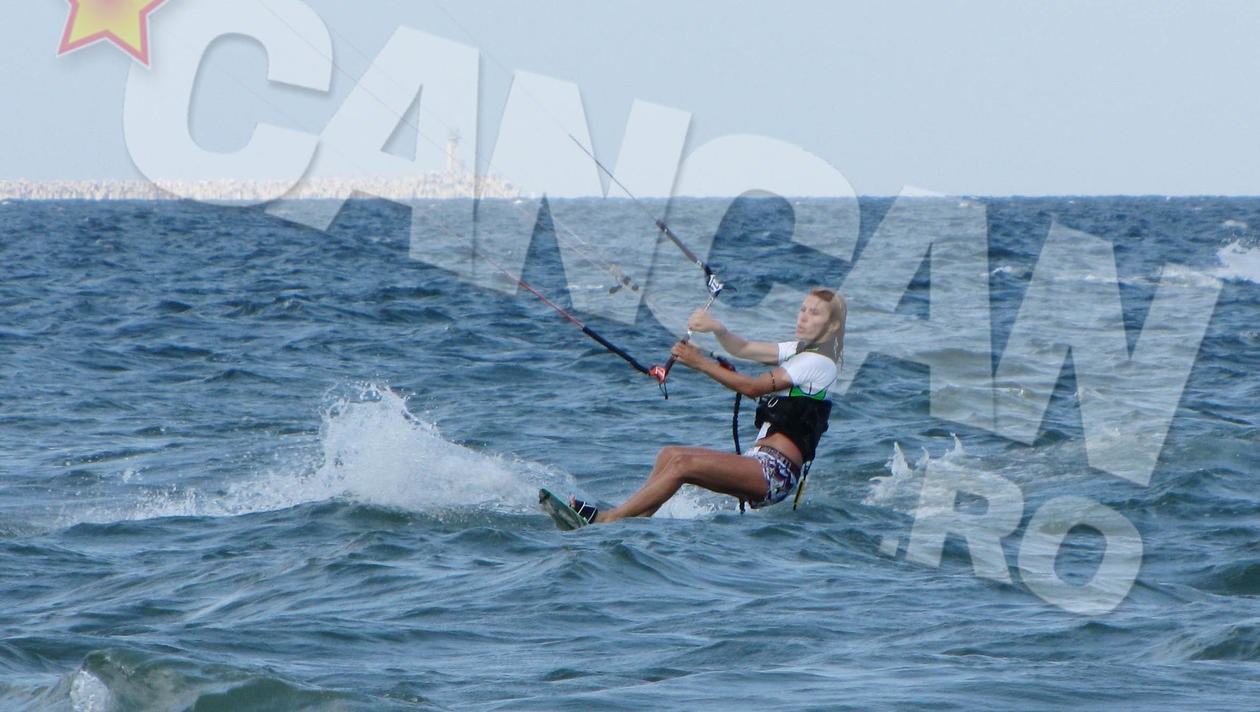 Vantul se inteteste si Sidonia isi trage pe ea echipamentul pentru kite. Sport tare popular, de cativa ani, si pe la noi. Desi, de data aceasta, este mai imbracata, Sidonia ramane la fel de sexy. Bluza mulata si briza marii fac din sanii milioanarei un adevarat spectacol. (i se vad sfarcurile bine de tot) Blondina intra in apa si, dupa cateva incercari soldate cu esec, incaleca valurile si incepe sa zboare… pe apa.