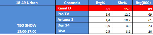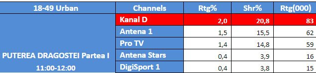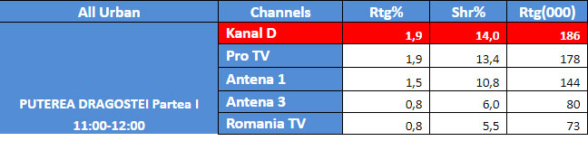 Astfel, in intervalul orar mai sus mentionat, Kanal D a inregistrat 2,0% rating si 20,8% cota de piata, pe targetul Comercial, 2,2% rating si 14,6% cota de piata, pe targetul National, si 1,9% rating si 14,0% cota de piata, pe targetul All Urban.