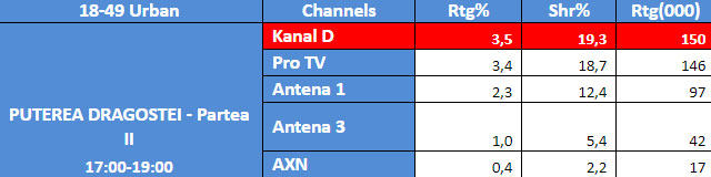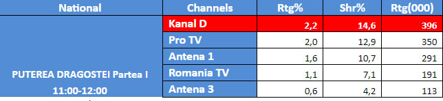 Pe intervalul difuzarii celei de-a doua parti a emisiunii matrimoniale „Puterea Dragostei”, de ieri, in intervalul orar 17:00 – 19:00, Kanal D si-a mentinut pozitia de lider de piata, in randul publicului Comercial. Astfel, conform datelor furnizate de Kantar Media, Kanal D a inregistrat 3,5% rating si 19,3% cota de piata.