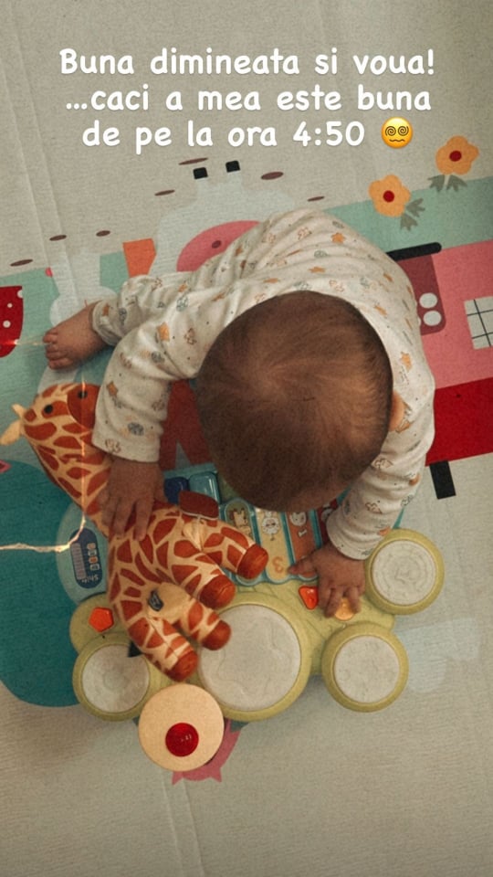 De exemplu, astăzi Josephine și-a trezit părinții la ora 04:50, iar imediat după trezire s-a dat startul la joacă. Gina Pistol a împărtășit cu internauții momentul și a recunoscut că îi puteau prinde bine câteva minute de somn în plus.