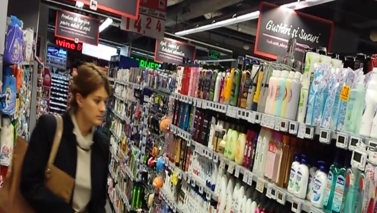 Sotia lui Gica Popescu sta langa raft, iar fata sa suce produsele la cos
