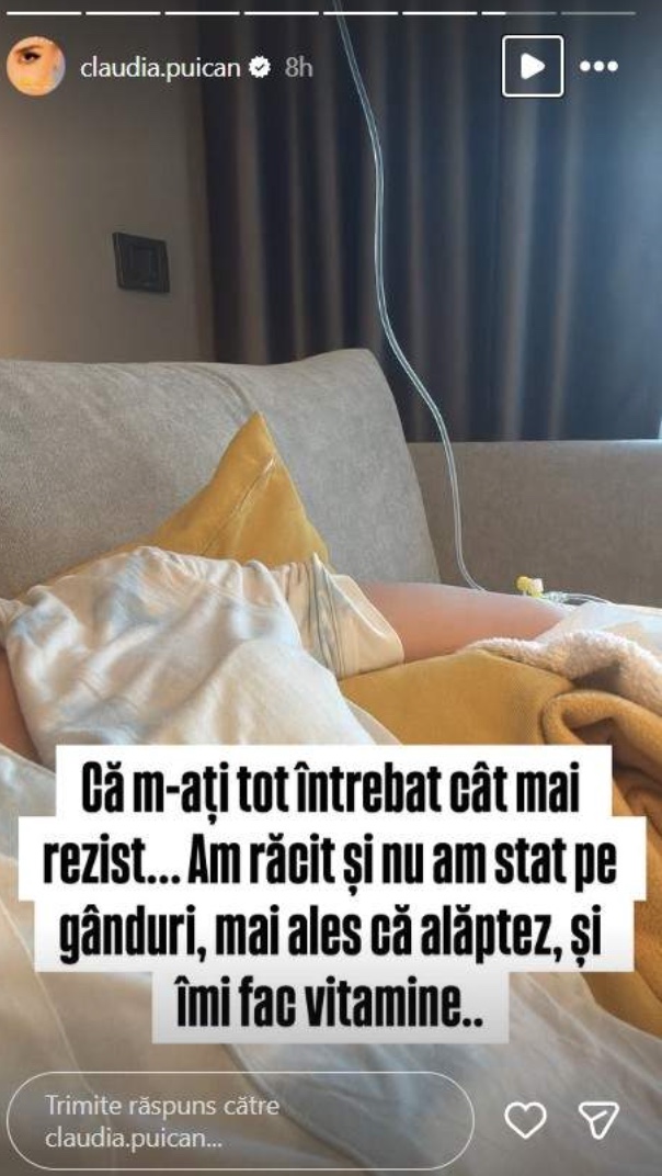 Foarte mulți s-au întrebat cum reușește Claudia să facă față unui program atât de solicitant, însă, de curând, aceasta a apărut cu o perfuzia la mână. Claudia Puican a mărturisit că se confruntă cu o răceală și, ținând cont că și alăptează, a decis să nu lase situația să se agraveze și și-a făcut o perfuzie cu vitamine.
