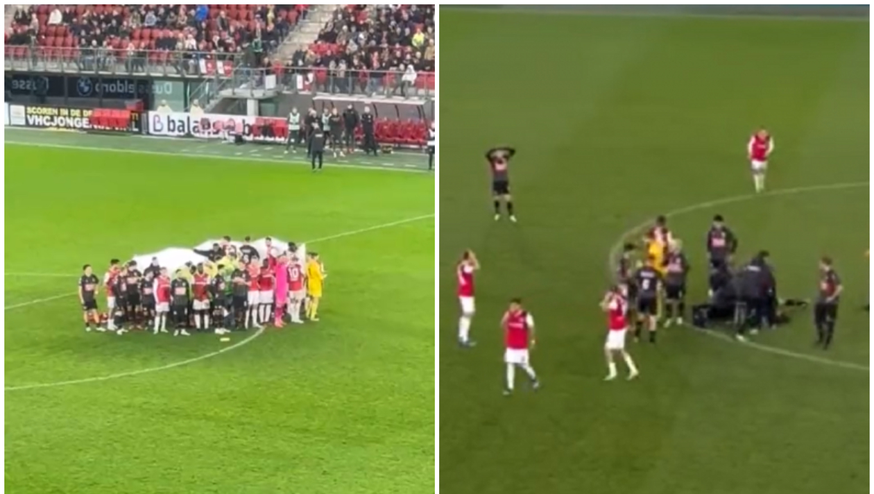 Drama at the @AZAlkmaar @necnijmegen match in The Netherlands – NEC’s Bas Dost collapses towards the end of the match. Players from both sides create a human shield before Dost regains consciousness and is stretchered off. Solidarity from both sets of players and fans. pic.twitter.com/ApF57410FC