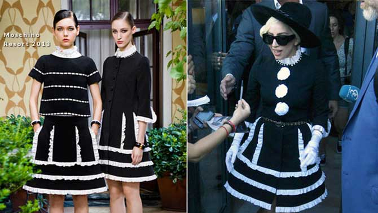 Ea a purtat o rochie negru cu alb din colectia 2013 de la Moschino, care inca nu este pe piata. Cantareata a accesorizat rochia cu manusi albe, palarie neagra si o curea subtire Chanel. Tinuta aleasa a fost totusi modificata pentru artista, mai exact aplicatia florilor albe pe partea din fata, astfel incat chiar si expertii sa creada ca Gaga a optat pentru o tinuta Chanel, nu Moschino.